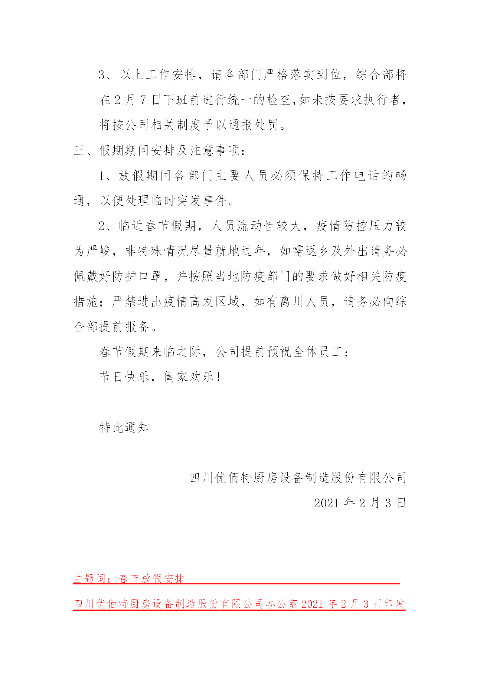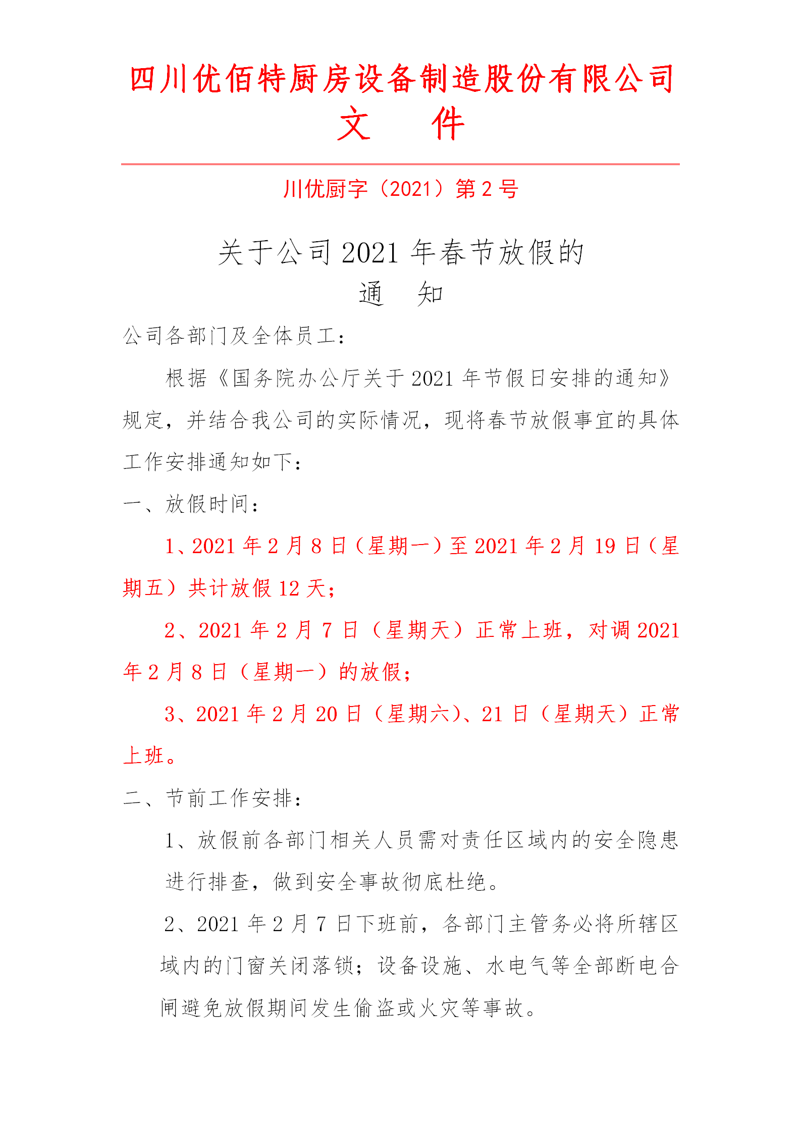 感謝你這一年來對四川優佰特廚房設備制造股份有限公司的支持,春節假期將至,優佰特公司祝你和你的家人新春快樂,財源廣進,萬事如意。我公司根據《國務院辦公廳關于2021年節假日安排通知》,并結合我公司實際情況,對春節放假做出如下安排: