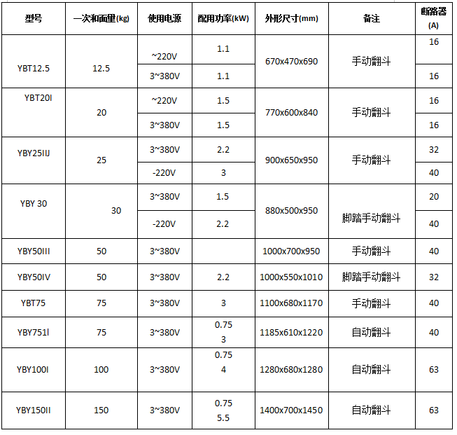 2、組成部分:主要有機架、面斗、腳踏翻斗機構、電器控制部分等組成。傳動部分采用圓弧齒蝸輪減速機及鏈條傳動,效率高、噪音低、壽命長。電機內置式:結構緊湊、封性好,電器控制部分通過控制按鈕,交流接觸器控制電機正轉、反轉、停止,漏電斷路器起過載、短路、漏電保護作用。
